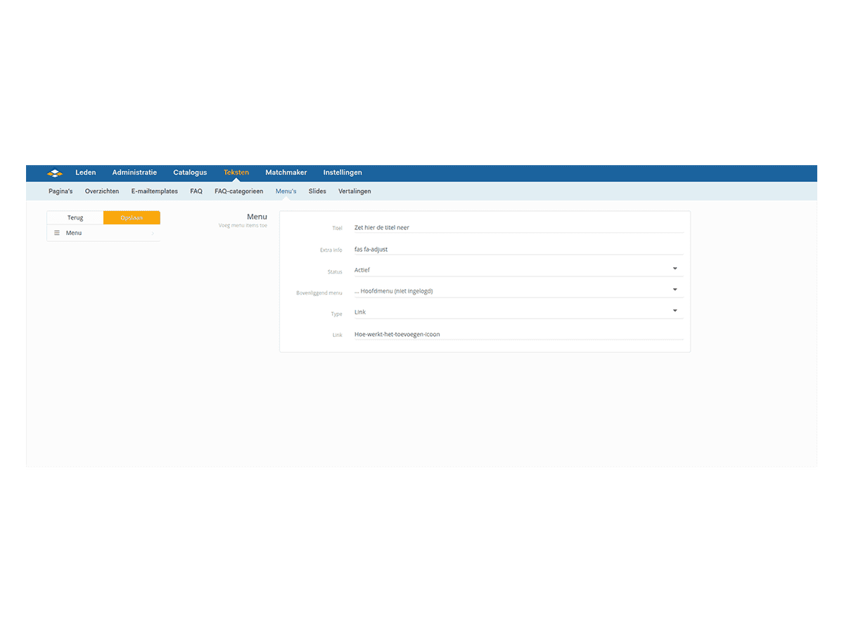 Via SiteCMS it is possible to provide menu items with an icon. This can contribute to the user-friendliness of the website. A menu with icons is more organized and easier to scan.