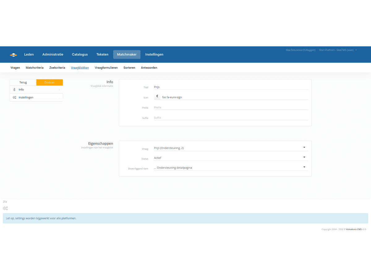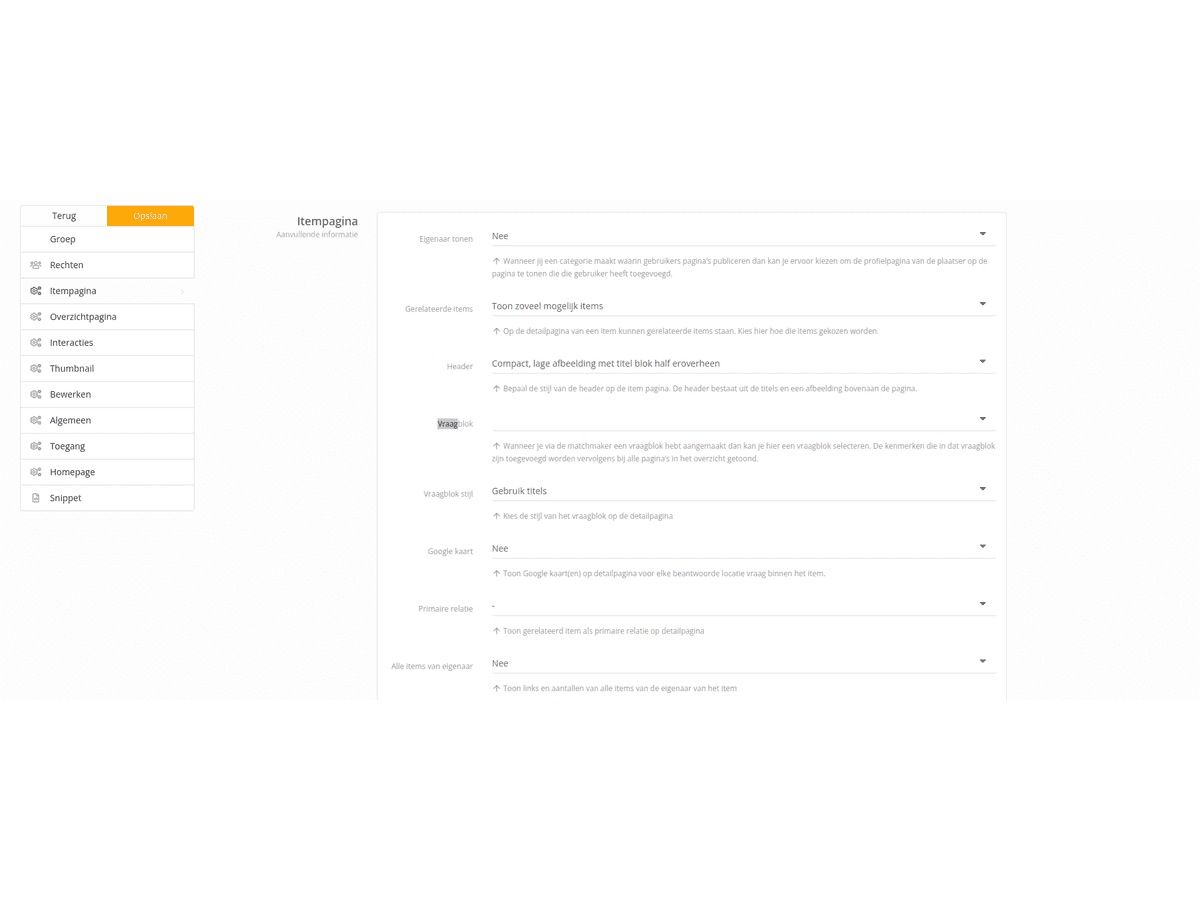 For each management group, you can set which question block is used for the thumbnail and for the detail page. For the profile page, these are already linked by default and this step does not need to be completed. Make sure that the management group and the question blocks are added correctly first.