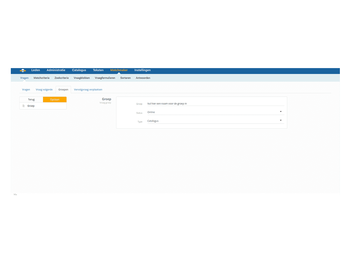 Create a new question group. To do this, go to the Matchmaker and then click on questions and select the groups tab. Enter the name of the group here, set the status to active, and choose the correct type.