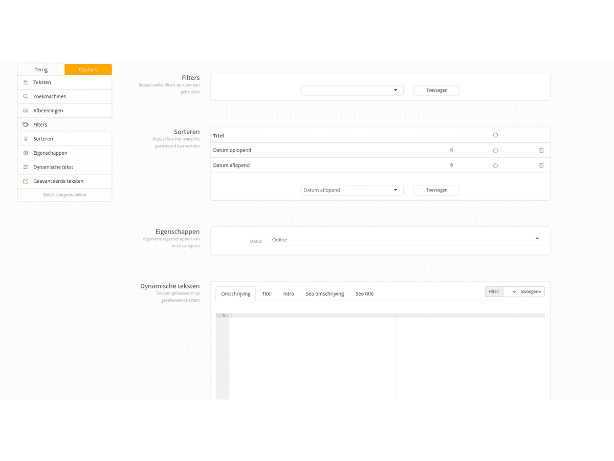 You can add multiple sorting options per category. These will then be displayed in the bar above the overview. You can also set which sorting is used by default. Visitors can then select a different sorting if desired.