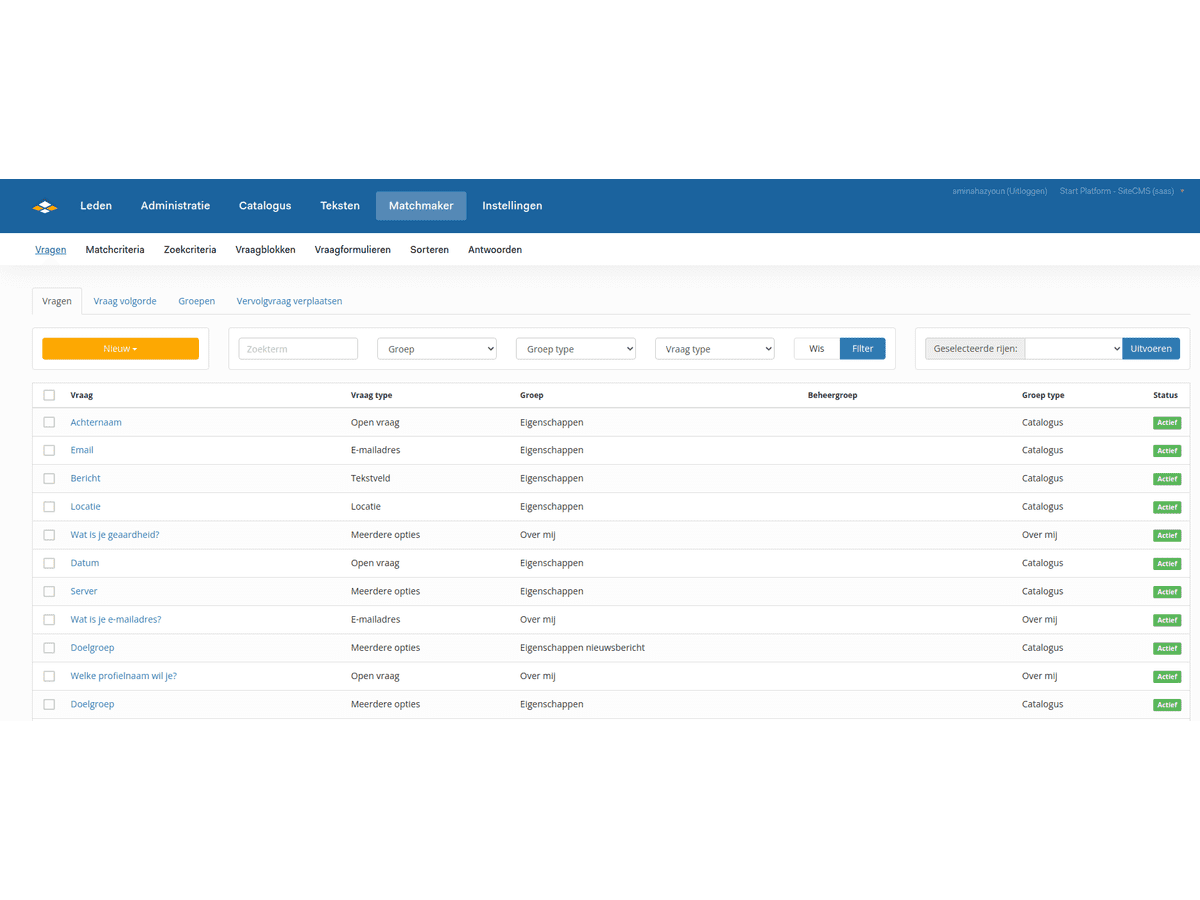 - Question form. Secondly, there is a dynamic part in this form. These are the questions that you can adjust. You can adjust these in question forms (Matchmaker> Question forms> Register). Here you can see which questions are linked to this form. Here you can adjust the labels and the placeholders, per question.